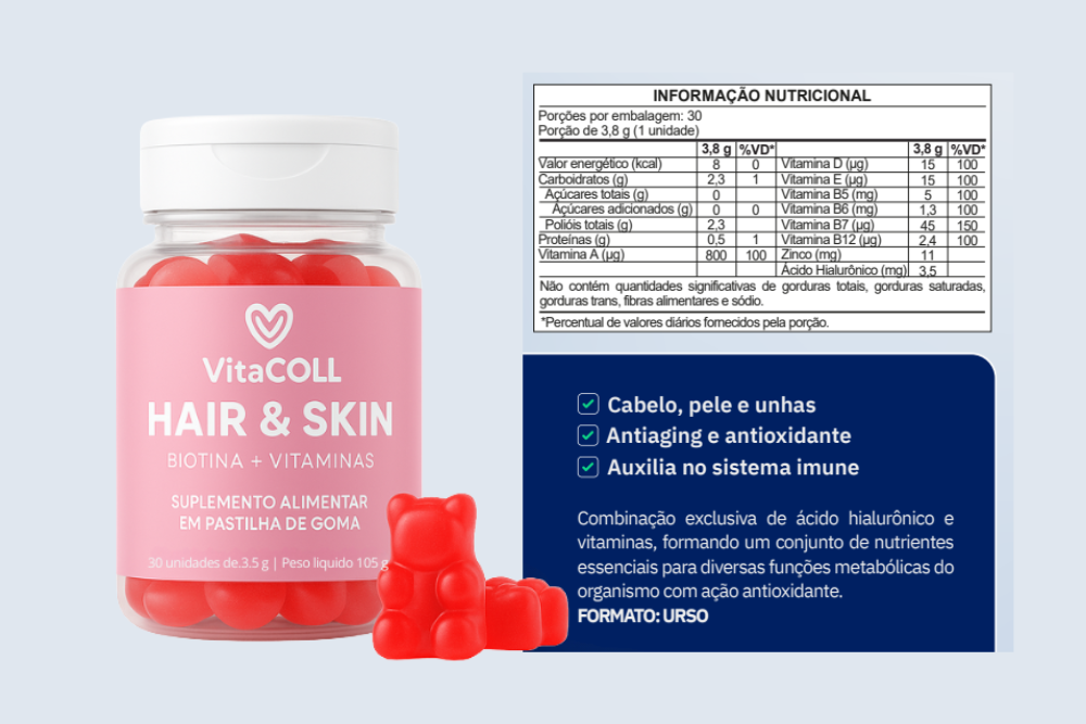 Descubra a beleza que vem de dentro com o VitaCOLL Hair & Skin Gummy. Um suplemento delicioso em forma de ursinhos de goma, desenvolvido para fortalecer cabelo, pele e unhas com uma fórmula rica em biotina, colágeno e vitaminas essenciais.